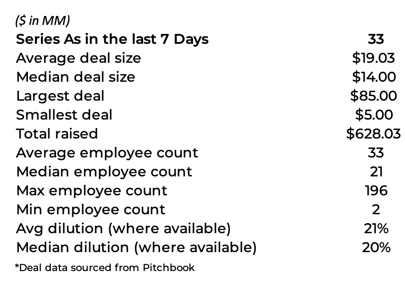 There were 33 Series As in the last week that raised a total of $628 million. The average deal size was $19 million while the median was $14 million.
