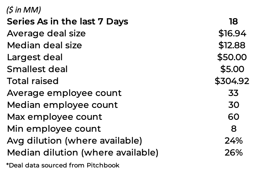 There were 18 Series As in the last week that raised a total of $305 million. The average deal size was $17 million while the median was $13 million.